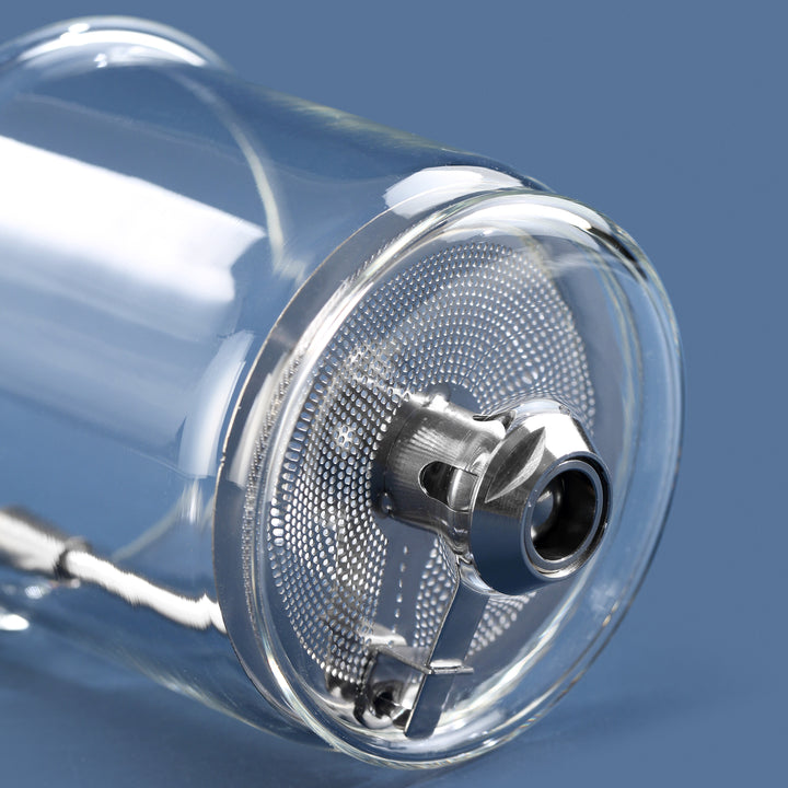 Théière à infusion contrôlée avec bouton-poussoir, en verre borosilicate et acier inoxydable. Design épuré et maîtrise parfaite du thé.