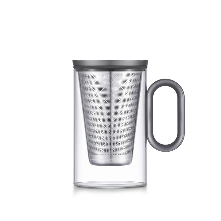 Découvrez la Tasse à thé Octagon, conçue pour les amateurs de thé les plus exigeants. Son corps en verre borosilicate transparent résistant à la chaleur permet de profiter pleinement de la couleur de l'infusion, tandis que le filtre en acier inoxydable à motif quadrillé assure une filtration fine et efficace. Le couvercle magnétique intelligent, en aluminium gris satiné, s'utilise aussi comme repose-filtre pour éviter les gouttes sur la table. La poignée ovale en aluminium gris métallique est ergonomique, robuste et agréable au toucher.