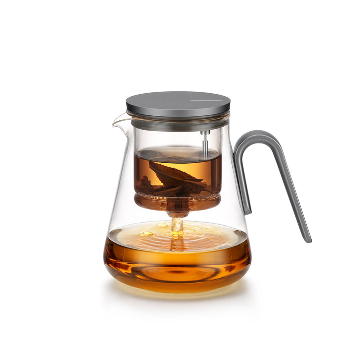 Fabriqué en verre borosilicate résistant à la chaleur, il dévoile la beauté de l’infusion à travers ses lignes épurées. Son filtre amovible en acier inoxydable, astucieusement  intégré, permet un contrôle optimal du temps d’infusion, tout en retenant efficacement les feuilles de thé. Une simple rotation du couvercle déclenche le mécanisme de piston, libérant instantanément le thé infusé dans la partie inférieure de la théière, pour une extraction parfaite à chaque tasse.